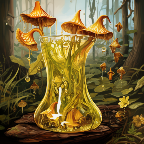 a pitcher plant filled in the centre with liquid honey gold, suspended from a stem, background of evergreen forests, zoomed in version of the pitcher plant, white moths fluttering around the pitcher plant, some feeding on the liquid gold nectar which fills the cavity of the pitcher plant, in a handpainted acrylic painting style