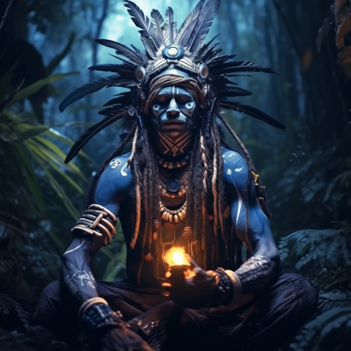 indigo blue arawak shaman with white braided hair, burning sage on right hand, inside the jungle, this in the mystic style.