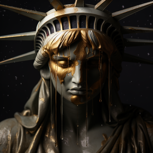 lady liberty crying gold and diamond tears while holding broken scales of justice, banksy style