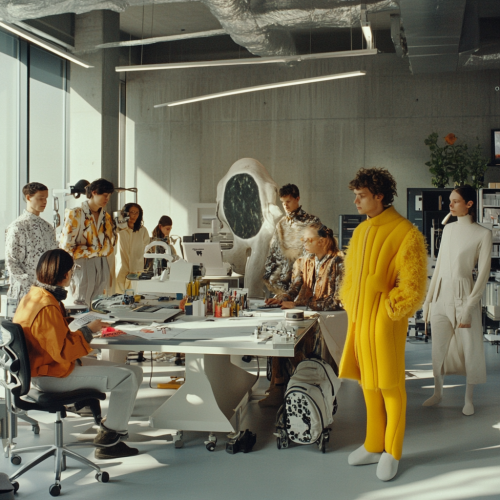 Movie Scene. Group of fashion desigers enhant pieces, they desing a wool coat moahair. Office looks like a modern workspace with weired shapes and innovative chairs. Keep the boundary between haute coture and futurism. Peoples on fancy coutches talking. People designing. everyone wearing very oversized freaky cloth. Visualize generative AI design like its a force of magic