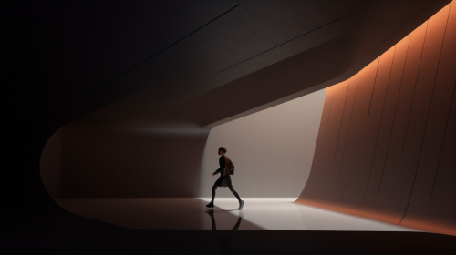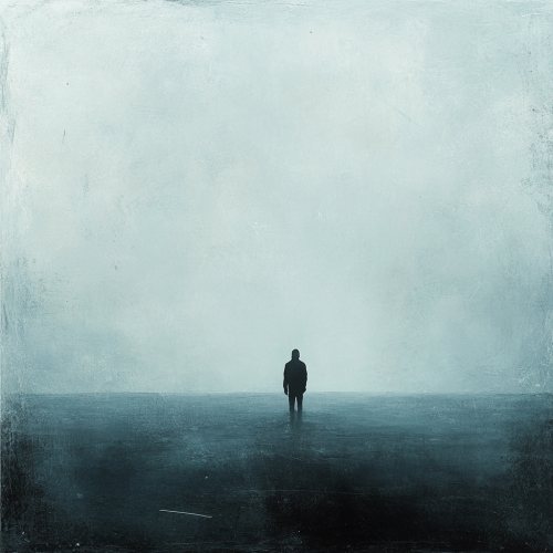 Design album art for the song 'Spare Me'. The artwork should convey a sense of plea or resignation. Use a subdued color palette with muted tones such as grays, blues, and soft blacks. Incorporate imagery that suggests a sense of distance or detachment, such as a solitary figure in a vast space, a fading silhouette, or an empty, echoing room. The style should be introspective and evocative, reflecting the emotional weight of seeking relief or understanding.