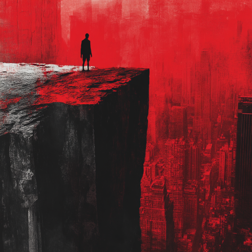 album cover, The same figure now stands on the edge of a desolate, monochrome cityscape where everything is in shades of black and white. They are separated from the vibrant red wilderness that lies beyond the city walls. The character reaches out toward the red wilderness, symbolizing their desire to escape isolation. The city behind them is lifeless and cold, contrasting with the warm, inviting red of the outside world. Use red, white, and black colors to emphasize the stark contrast between the environments. --s 250