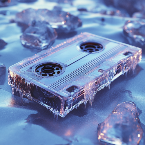 close up audio cassette tape frozen in a winter environment, large icicles around, highly detailed, hyper realistic 16k, light blue winter tones, global illumination