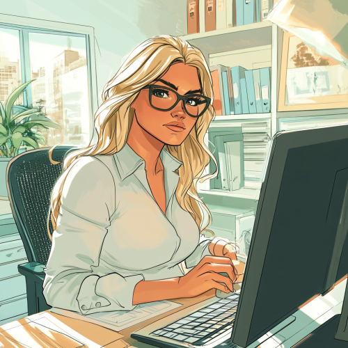 one audit specialist is working in his home office in the afternoon. She is an ugly blond caucasian female with glasses, wearing causal office clothes. She is Super happy because he has found a solution. In American Modern Comic Style with these HEX colours are predominant in the image: HEX #1F1E59, HEX #7B18E7, HEX #C014C3, HEX #E71884, HEX #F7931E