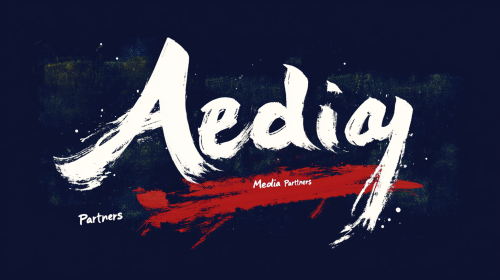 "Axy" logo in a large, striking white brush script, centered on a deep navy blue background. "Media Partners" is displayed beneath in the same bold, expressive white brush script. A dynamic red ink stroke flows beneath like the Shinnyou radical, suggesting movement and grace, enhancing a modern, sophisticated feel. Created Using: custom brushwork, Japanese art influence, clear color contrast, digital design software, strong visual impact, fluid aesthetics, high-definition detail --ar 16:9 --v 6.1