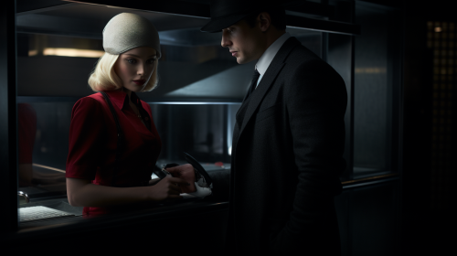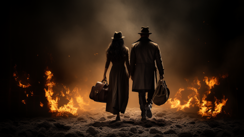 Bonnie with blonde hair and Clyde walking away from a bank with bags of cash. Dark background with cash floating around in the air. --ar 16:9 --c 20