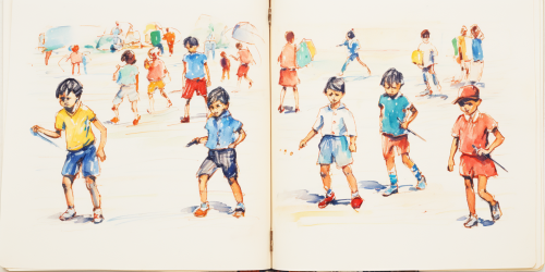 crude notebook sketch of children in different states of playing, standing and sitting, colorful --ar 18:9 --v 5.2