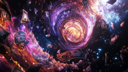 Hyperrealistic cosmic landscape, swirling nebulas of golden coins, ethereal money energy flowing through space, intricate details, cinematic lighting --ar 16:9 --s 50