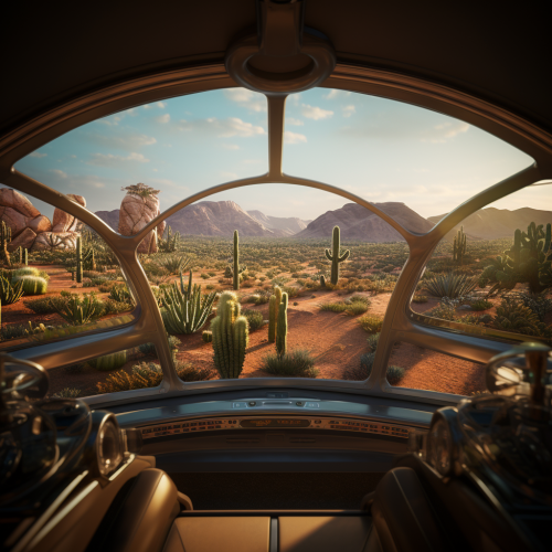 point of view from inside a ufo with a view of the desert and cactuses. The ufo has large falt screens, high tech futristic controls and a large window