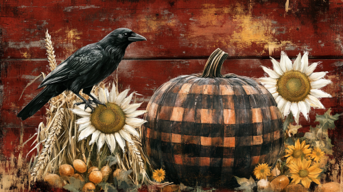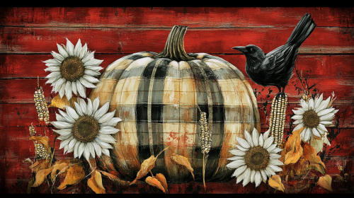 A large plaid pumpkin with deep cracks, white sunflowers with a grunge finish, and a realistic raven among corn stalks, all framed by a dark red chippy wood background. The fall theme is highlighted by soft watercolor effects. --ar 16:9