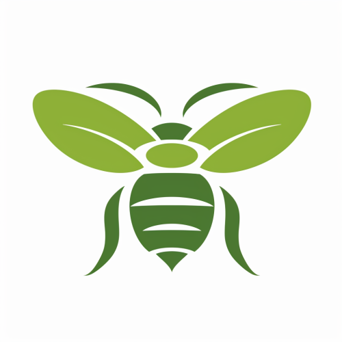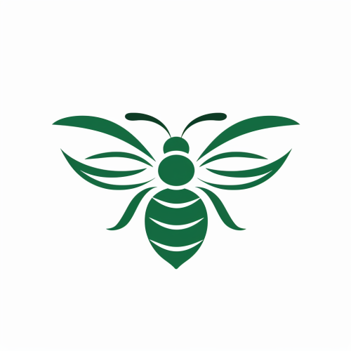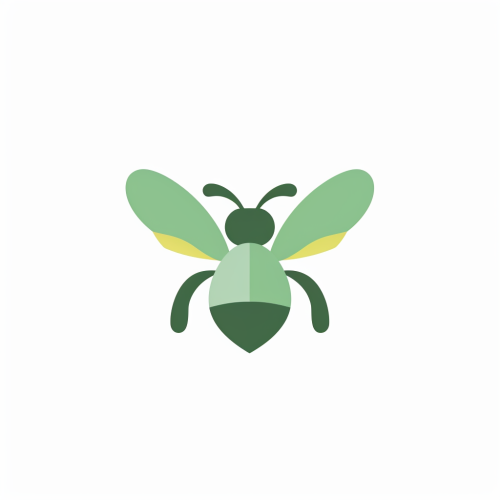 A highly simplified green bee symbol, with a circular body and two small, stylized wings made of curved lines. The design is very abstract, using as few elements as possible while still recognizable as a bee. Plain white background, flat design --ar 1:1 --v 6.0
