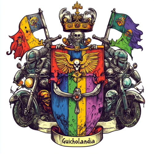 crear escudo de armas de un país imaginario llamado "Guicholandia" debera de estar dividido en 4 areas, una representando motocicletas, cervezas y comunidad gays, encima del escudo tendra que tener una corona, fondo de imagen en blanco