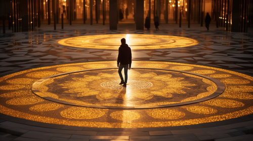 high-end paver made of sequin fabric, yellow and brown, Islamic pattern, simple, tile, with a people next to it, 8k --ar 16:9 --s 200