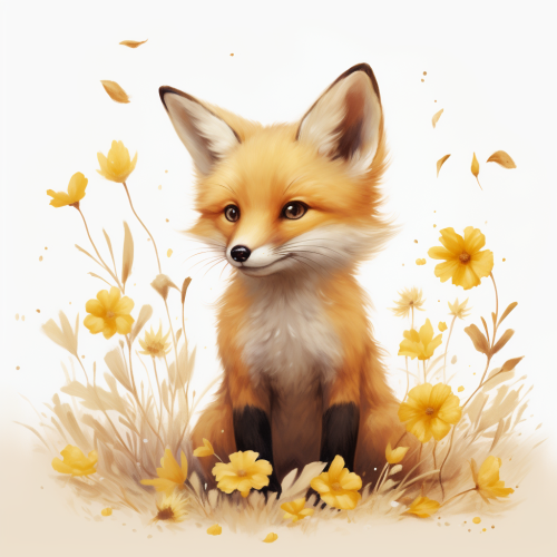 little fox on a white background art print enlarge version, looking forward, baby fox, in the style of birds & flowers, in style of Leo Lionni, animated gifs, lighthearted, yellow and amber, elegantly formal, fairycore, depiction of animals