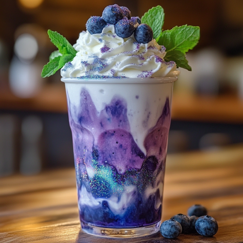 RECIPE NAME: Lunar Frappuccino Wave Ingredients: 1 cup ice ½ cup milk (any kind) ½ cup vanilla ice cream ¼ cup blueberry syrup ¼ cup white chocolate syrup ¼ teaspoon edible glitter (optional) 1 tablespoon whipped cream Fresh blueberries for garnish Mint leaves for garnish | Amateur photo from reddit, taken with an iPhone 15 Pro. | SHOT TYPE: Macro Shot Focus on the details --ar 1:1