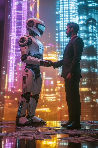 robot shaking hands with a man in a suit, dollar bills on the floor, skyscrapers in the background, futurism, realism, high quality photo, orange, yellow and purple shades, --ar 2:3