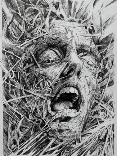 A rough, chaotic pencil sketch with unsettling, mysterious, spiritual, chaotic pencil lines, depicting a distorted and crazed figure representing the fractured psyche of a modern, unhinged human. The figure is drawn with twisted, jagged lines, giving it a grotesque and eerie appearance. The background is filled with swirling, dark patterns that enhance the sense of mental instability and fear. The overall image is intentionally rough and sketch-like, capturing the terrifying, unsettling essence of a mind unraveling in a chaotic, modern world, with a strong emphasis on the spiritual and psychological horror. --c 8 --ar 3:4 --v 6.1
