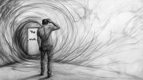A rough, chaotic pencil sketch with unsettling, mysterious, spiritual, chaotic pencil lines, depicting a figure walking away from a door labeled as "The Truth." The figure is covering their eyes with one hand, as if deliberately avoiding seeing what lies behind them. The lines are jagged and abstract, creating a sense of tension and denial. The background features swirling, chaotic patterns that suggest a complex and hidden reality. The overall image is intentionally rough and sketch-like, capturing the eerie and unsettling nature of avoiding the truth, with an atmosphere that feels both mysterious and foreboding. --c 8 --ar 16:9 --v 6.1