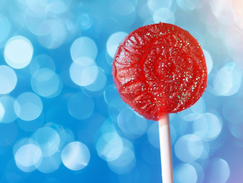 this lollipop was taken from the front. shiny transparent flat red lollipop on a blue background. lots of glitter, blur, shimmer, sparkle, a little retroA bit of bright Disney style --ar 4:3 --v 6.0