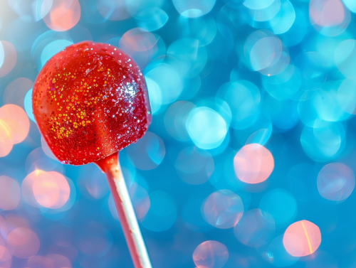 this lollipop was taken from the front. shiny transparent flat red glass lollipop on a blue background. lots of glitter around, blur, shimmer, sparkle, a little retro. A bit of bright Disney style --ar 4:3 --v 6.0