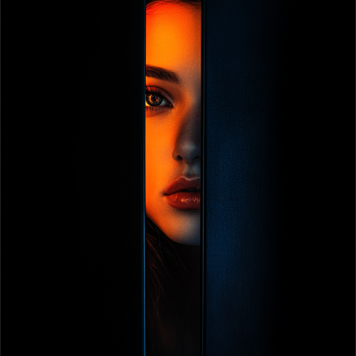 High quality picture, 16 * 9 in size, which looks realistic, on a black background with orange and dark blue inserts, a woman who is as if in a frame where she is cramped