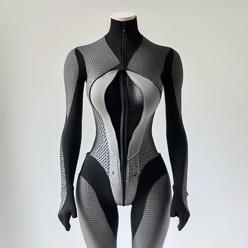 a Yeezy looking wet suit ,weird fitting , a womens tight abstract fitting bodysuit , neoprene fabric , the body suit is black and grey , behind white backdrop