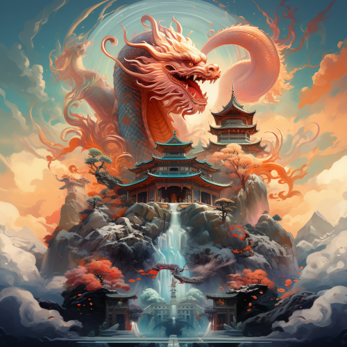 a Chinese New Year poster showing a dragon flying on top of a daoism temple sitting on mountai --s 250