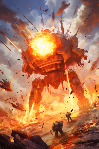 abstract oil painting. Futuristic and dystopian. A battlefield. Rockets are being fired from a rocket artillery rocket pod. On the shoulder of a Mecha robot. --ar 2:3