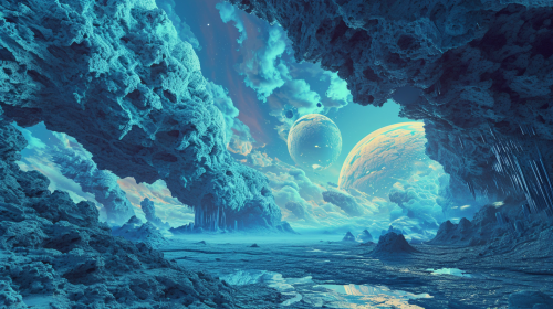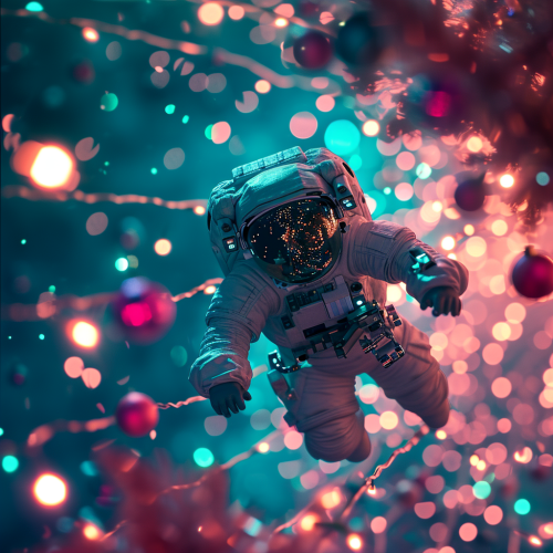 an astronout with a christmas hat flying in space with background of an abstract look with bokeh of a christmas lights and decorations in a cyber punk interior with pink blue and turquoise light traces --v 6.0