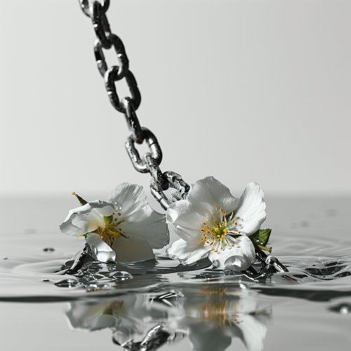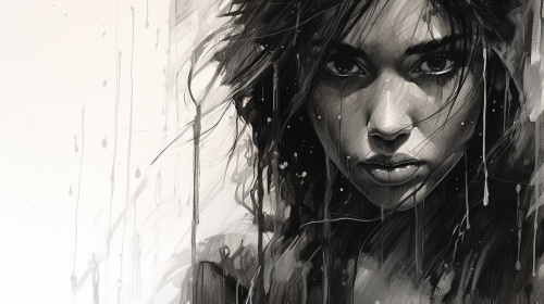 a beautiful woman with red hair and blue eyes dancing with joy, amidst a chaotic rain storm, bustling city in turmoil around her, dark clouds above, yet her posture shows confidence, peaceful, and resilient. Rays of light breaks through the dark clouds and onto her face, as she gazes upward towards the light. At her feet are small, burgeoning plants and flowers --ar 16:9 --v 6.0