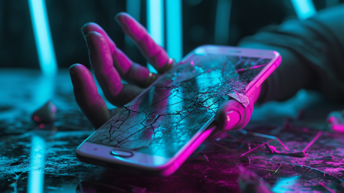 a lifeless hand with broken manicured nails, holding a smartphone, neon, glow in the dark --v 6.0 --ar 16:9 --s 50