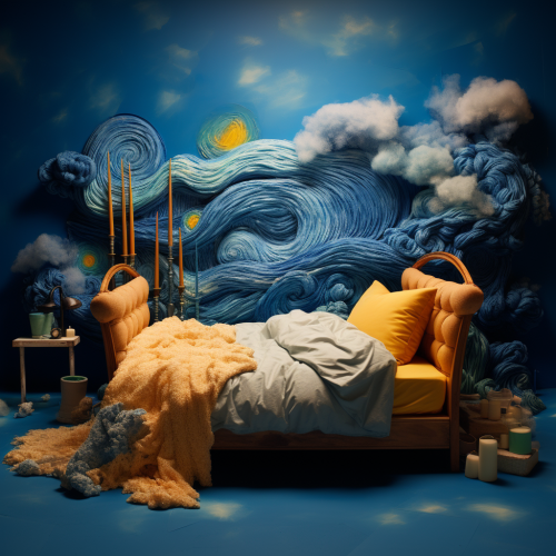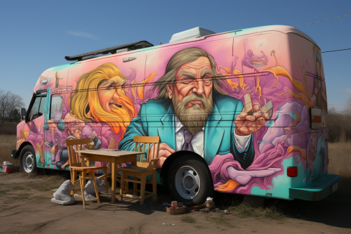 Donald trump and rasputin having conversation sausage mural painted in pastelle colors made of gelatine and is parked in a beautiful countryside with crop fields in the background. The camper has fins and windows and awning installed to make it more welcoming. There is a filthy hippie in front of the camper. photorealistic, hasselblad camera, in bedroom at night, real image , raw image shoot, realistic image --s 750 --ar 3:2