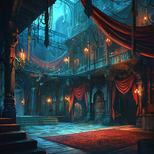 un escenario con telones y pantallas azules y rojas, en la noche, estilo epico --v 6.0