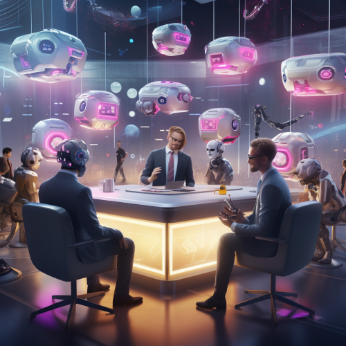 Create a wide-angle photo of with four generative AI chatbots engaged in animated discussion, with gestures and expressions of critique, agreement, and thought. Each chatbot should be cute and very different looking from one another. They're in a room depicted as a futuristic command center. Desired resolution is 1920x1080 pixels.