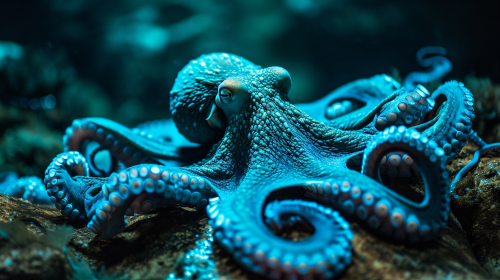 giant blue phosphorescent octopus in ink black water --v 6.0 --ar 16:9 --s 200