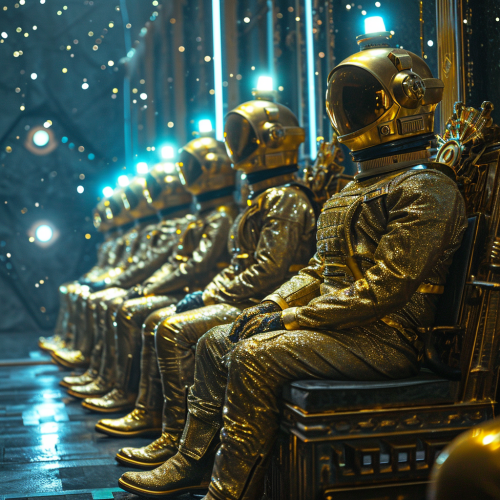 a row of people sit on golden thrones in space in golden spacesuits with luminous crowns --v 6.0