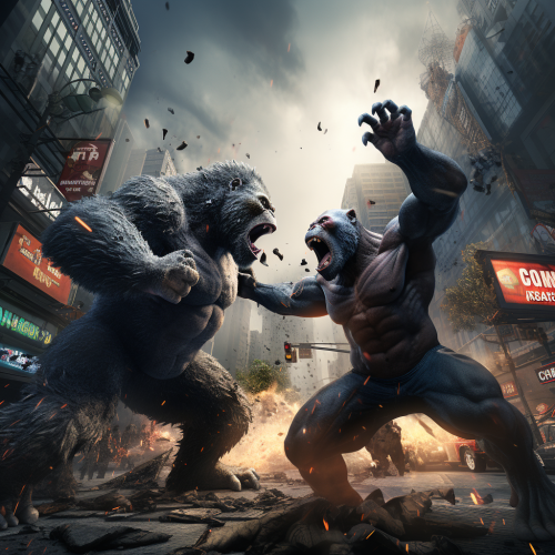 Generate a dynamic CG rendering of an intense street fight scene featuring an unexpected clash between a powerful gorilla and a towering giraffe. Picture the chaos of this urban showdown, with the gorilla and giraffe engaging in a fierce, larger-than-life battle. Capture the raw energy and impact of their confrontational poses, emphasizing the surreal and extraordinary nature of this street brawl. Play with lighting, shadows, and textures to heighten the drama of this unlikely matchup, creating a visually compelling and unforgettable scene.