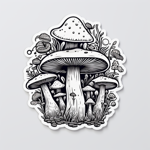 magic mushroom pop culture sticker with clean outline and white backround black and white, no color, minimalist