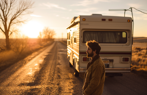 20 year old man standing in front of 1970s RV, standing on the side of a rural highway --ar 17:11 --v 6.0
