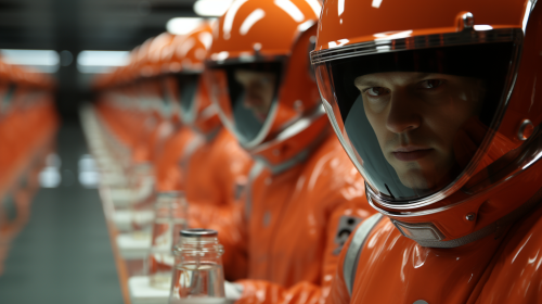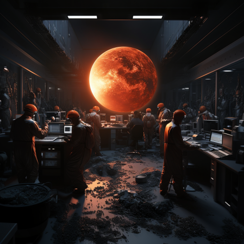 Dark laboratory with orange color #F1A33D, solar eclipse, moon HD, scientists gathered around