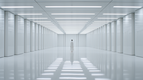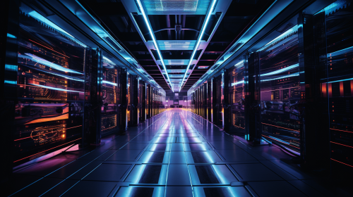 Eye level magazine style photo of data center captured on Cinestill 800T using a Sony A7R IV for a dramatic effect --ar 16:9 --s 50 --v 5.2 --style raw