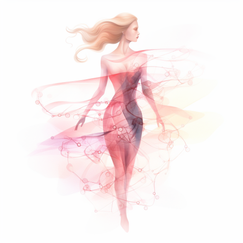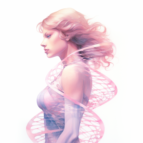 white background image with an abstract illustration that represents with simple lines and watercolors in pink tones the silhouette of the body of an elegant woman and a fluid DNA molecule in a range of pastel pink tones with color degradation --ar 1:1
