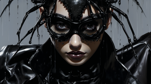 Proud arrogant beautiful androgynous entity with many glossy spider eyes wearing glossy black leather straps with steel o-rings and buckles designed by Iris van Herpen, smoking a cigarette in the rain, illustrated by Juan Giménez --ar 16:9