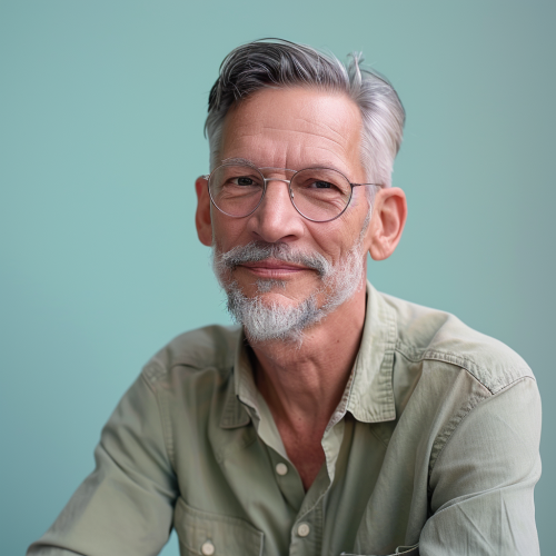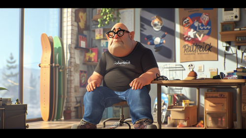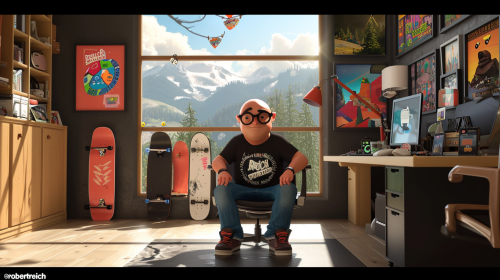 Create a 3D illustration of an animated character wearing jeans, black tshirt, and sitting on a desk. The character < distinguished, handsome, round face, bald, wide shoulders, thick chest, round eyeglasses, 50 years old>. The background includes several longboards with company logos hanging on the walls, AI-generated art, and a large window with a view of the flatirons from Boulder Co. One of the longboards has a social media profile picture that matches the animated character with the user name "robertreich" below. --v 6.0 --ar 16:9