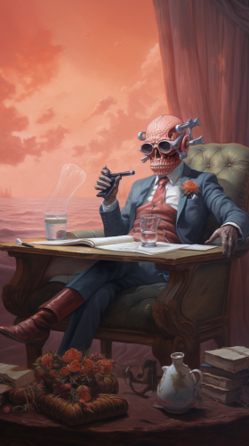 an anthropomorphic coral sitting at a desk upon which rest a tumbler of whiskey and a hand gun --ar 9:16
