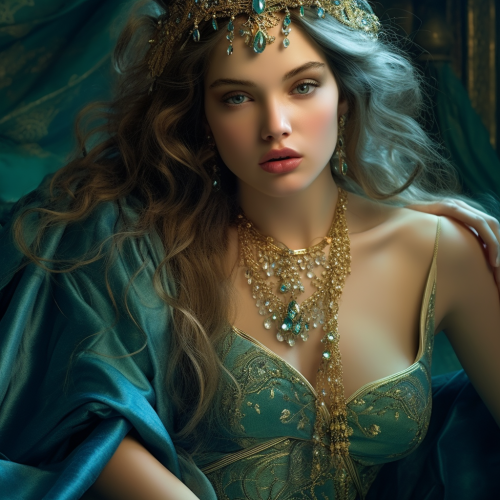 beautiful woman, ice blue, emerald green, shiny gold, ethereal, fantasy