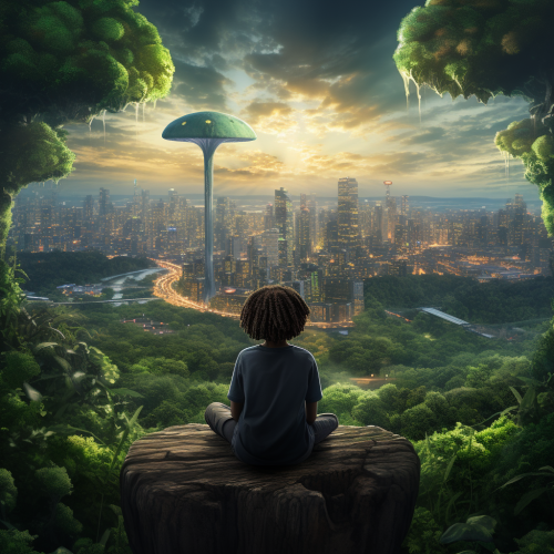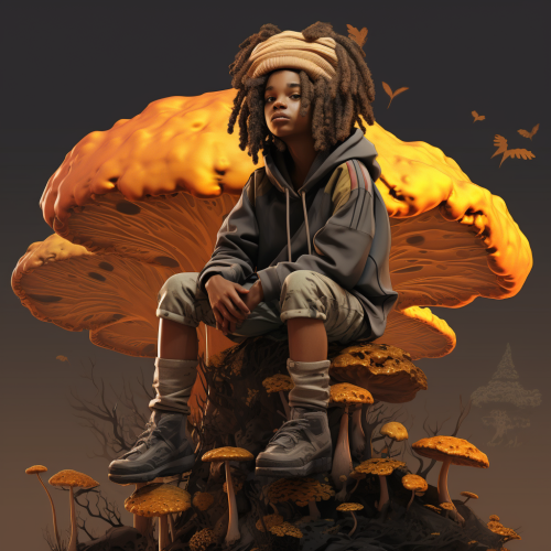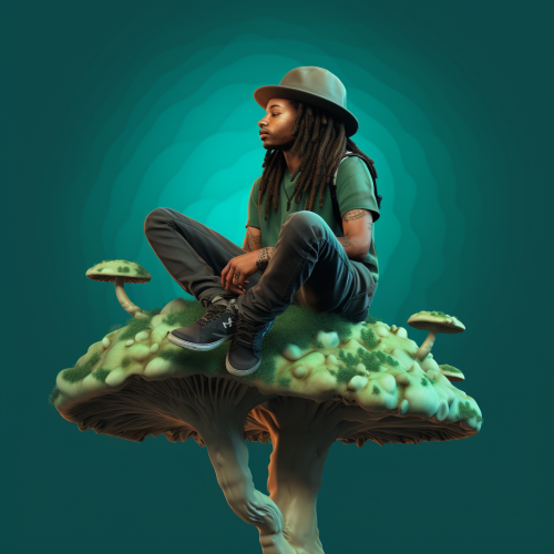 a black 23 year old with titanium colored dread locs going down, sitting on a mushroom that’s has a brownish blueish green radiant tone to it. 3d rendered. animated. adobe illustrator