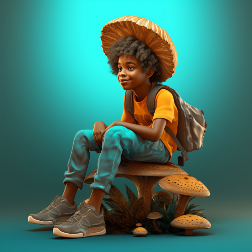 a black boy with titanium colored long dread locs, sitting on a mushroom that’s has duo tone to it. 3d rendered. animated. adobe illustrator