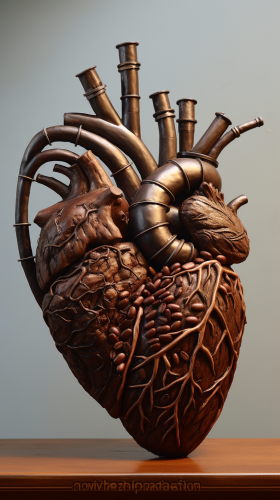 Imagine a human heart shaped in a unique and enchanting way, where it is entirely composed of coffee beans and their derivatives. This unique heart has a special beauty, with every chamber and canal formed from carefully roasted coffee beans. The atria and ventricles appear as a blend of dark and light coffee beans, creating a stunning contrast in colors. Also, envision that the arteries and veins surrounding the heart are made of threads of ground coffee, flowing to and from it like mysterious liquids. Each heartbeat in this heart releases a rich aroma of coffee, mixed with scents of chocolate and caramel, making it a source of vitality and warmth. The valves in this heart look as if they are made from green coffee leaves, opening and closing regularly, directing the flow of coffee in this magical organ. This fantastical heart is not just a vital organ, but a work of art, embodying love and passion for all things coffee; --ar 9:16 --s 50