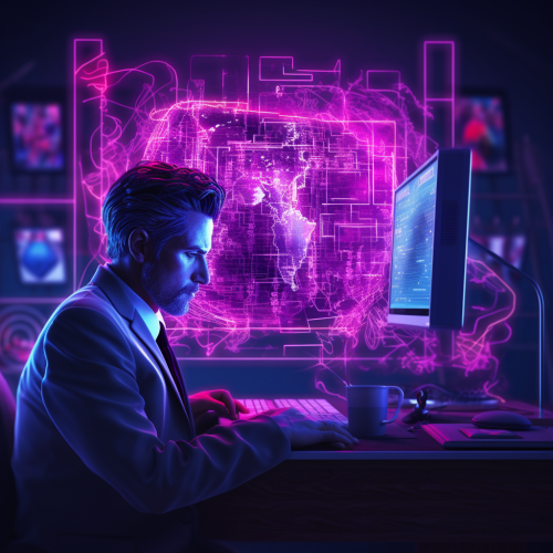 BUSINESSMAN LOOKING AT THE COMPUTER, ON THE COMPUTER A GRAPHIC BELOW, WELL-DEFINED FACE, 4K((ULTRAREALISTIC)) NEON PURPLE COLORS